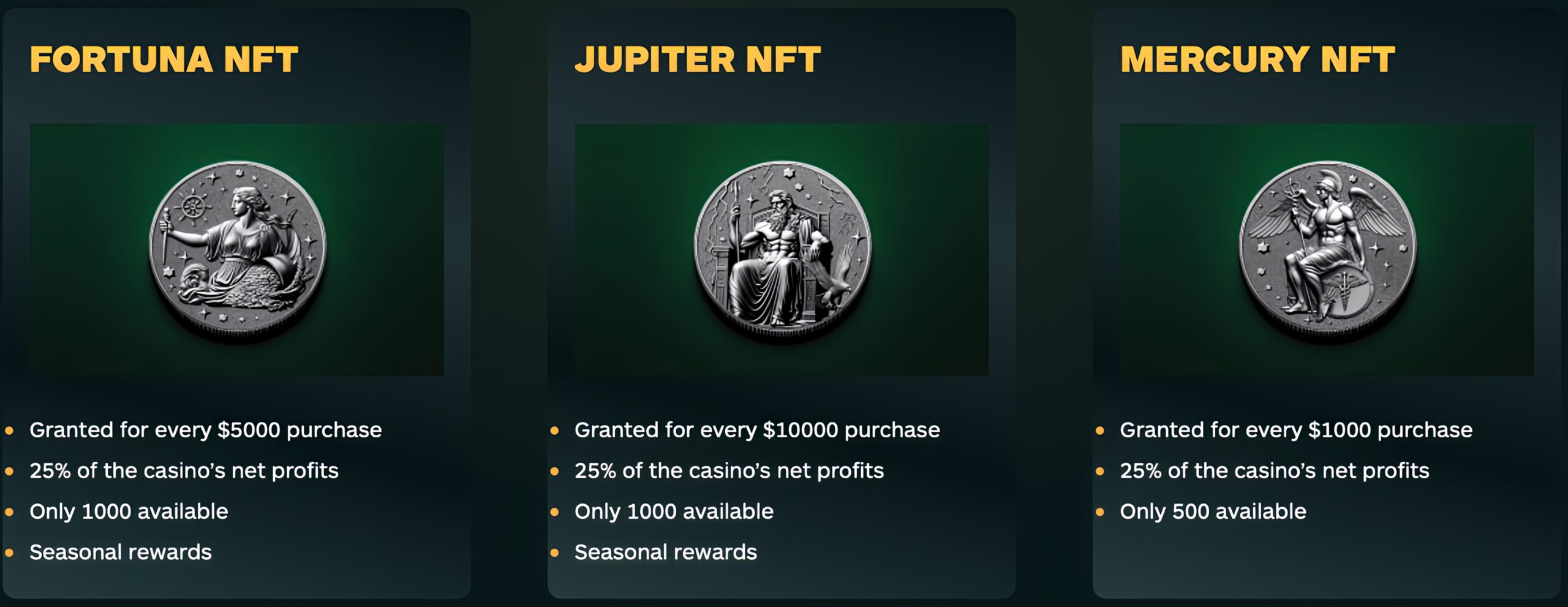 In order to get one of the 2500 NFTs that give the owner a lifetime share of 25% of the casino’s net profits, you first need to buy a minimum of $1000 worth of $Nummus tokens. When you do that, you will automically be sent an email to your verified email address, asking if you want to take part in the NFT offer.